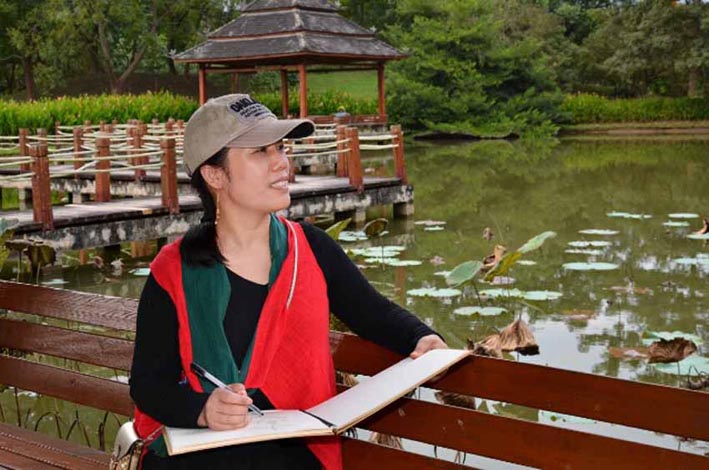 吾与友交往卅年长,情挚义重,熟彼此习性。友每在艺场逢得良师益友,必与余诉之一二。闻友曰:怀芝自幼聪颖,随其外祖母遍读古诗词,文心敏睿之艺人稀罕,着画较一般艺人,其画风骨气清绝,神逸横出,并不似女子手迹!更添古韵神采。加之其孜孜求学,画笔不辍,从不恃才自傲,待人诚善亲和谦逊,众人皆喜。